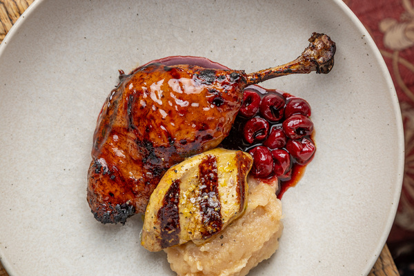 - Утка конфи с яблочным пюре и фуа-гра - 1290 руб.: новое фирменное блюдо. Сочная утиная ножка, запечённая в пицца-печи до хрустящей корочки. Подаём с жареным фуа-гра, пюре из яблок с бадьяном под вишневым соусом. Жирный жир!