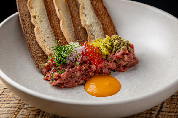 - Тартар из говядины с красной икрой и гренками - 990 руб.: новое прочтение легендарной закуски в «Горыныче». Выдержанная говядина, каперсы, икра и соус из перца, запечённого на гриле. Подаём с гренками двух видов - ржаными и пшеничными.
