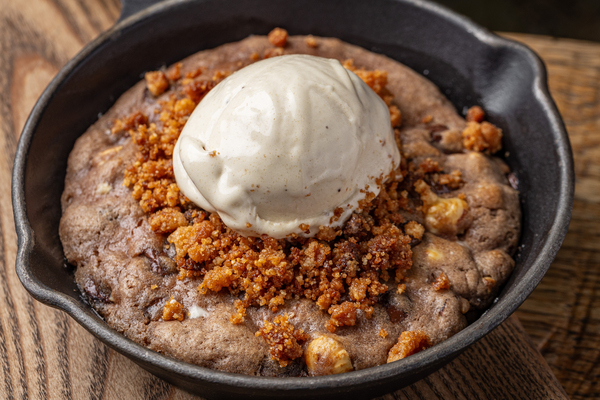 «Горыныч» - шоколадный фондан с фундуком и банановым мороженым - 690 руб.. Горячий шоколад, хрустящий крембл, фундук и шарик бананового мороженого. Печём в огненной печи, как и положено в «Горыныче».