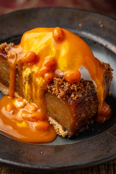 Яблочный тарт татен с гречишным мороженым и облепихой - 590 руб.: 50 тонких слоёв зелёных яблок, карамелизированных вручную, запекаются при низкой температуре на песочном корже. Подаём с гречишным мороженым и облепиховым соусом. Французская классика с северным характером.
