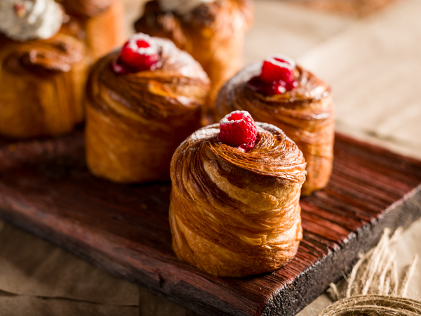 Из сладких нот — воздушные круассаны (280 руб.), золотистые кранчи с маком (520 руб.) и яблоком (520 руб.), рогалики с яблоком (210 руб.), а также эффектные краффины с вишней и сырным кремом или малиновым джемом и маскарпоне (360 руб.).