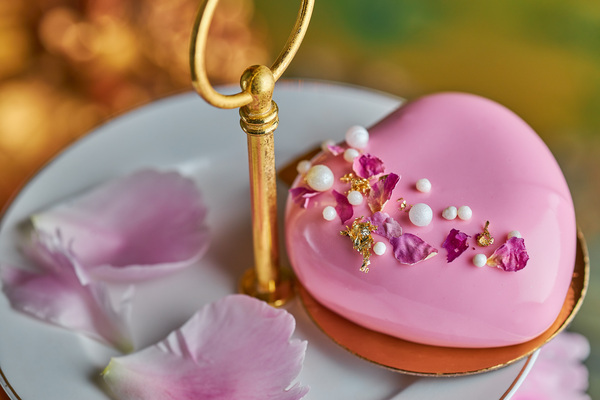 Пирожное «Сердце» — лимонный бисквит с чайной розой, белым шоколадом и вафельной крошкой, внутри которого сливочный мусс и начинка из клюквы, клубники и земляники. Эклер с кремом-пломбиром и малиновым конфи украшен помадкой и бутоном из мастики.