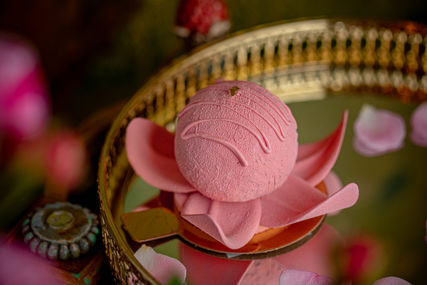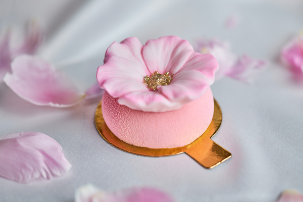Пирожное «Кувшинка» вылеплено из розового велюра, под которым скрываются лимонный и кокосово-миндальный бисквиты, заполненные малиновым кремом и муссом из белого шоколада и мака.