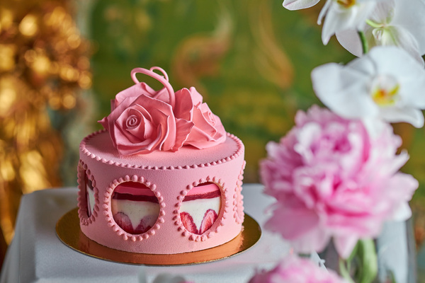 Торт «Клубничный франжипан» с розами из карамели сделан из свежей клубники, ванильного мусса с цветами апельсина, клубничного желе и карамелизированных фисташек.