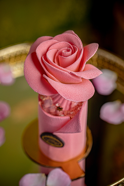 «Королевская роза» — это миндальный бисквит, малина и конфи каркаде под куполом белого шоколада; в центре — ванильный ганаш с темным шоколадом.