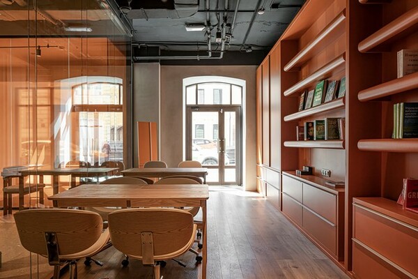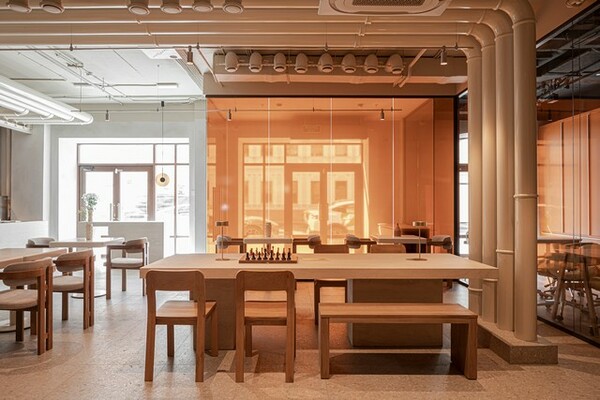 При входе внимание притягивают колонна в шашечку, открытые трубы и массивный стол с разными сценариями посадки. За счет теплого освещения и цветовой палитры в помещении создается эффект заката. Зонирование понятное и эргономичное: LOOK UP — бар, кафе и магазин, в UPSKILL — университет с 16 классами, маркерно-магнитными стенами и проекторами.
