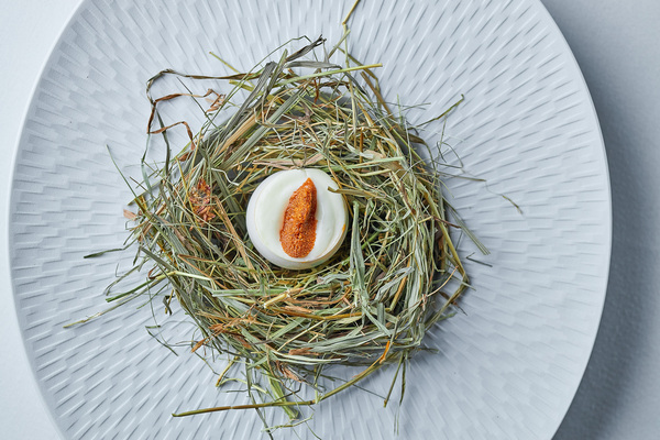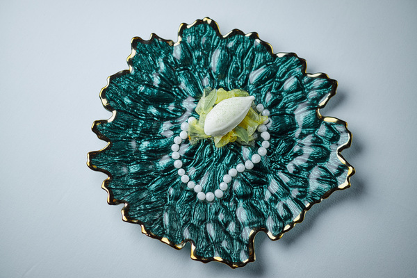 Особое внимание при создании сета шеф уделил визуальному компоненту, тщательно продумав каждую из подач. Переработав один из старых рецептов, Эдуард подает улиток на большом камне, а соус к ним прячет в ракушке. Пармантье с камамбером приносят в ажурной вазе, а нарядные шоколадные конфеты – в железной коробочке на душистом перце.
