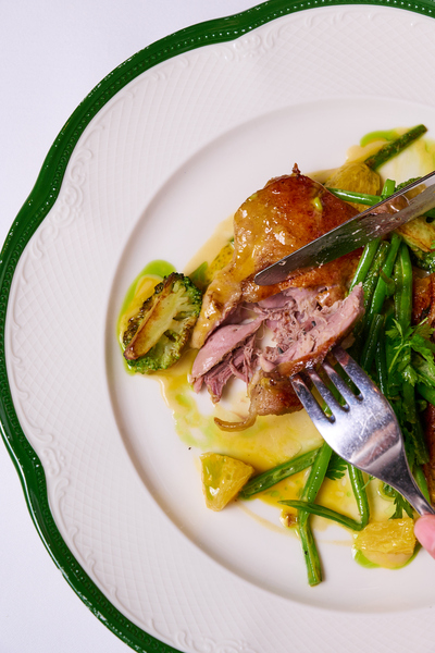 Утиная ножка конфи с картофельным парментье зелеными овощами и маслом апельсина — 2 100 руб.;