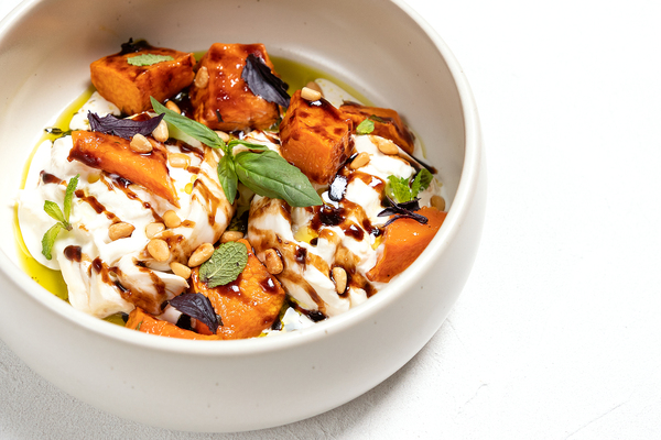 Например, бородинские эклеры с кремом из печени трески (1290 руб.) – отличная закуска перед обедом и классный пейринг к осеннему коктейлю или к порции крепкого напитка. Ароматный бородинский хлеб с хрустящей корочкой, хорошо знакомый с детства, намазан нежным кремом из печени трески и украшен щучьей икрой, половинками перепелиного яйца и овощами. Еще одна новая закуска – буррата с тыквой и соусом из бальзамического уксуса (1260 руб.): тыква запечена с медом и тимьяном, благодаря чему приобрела деликатную сладость и пряный аромат, а само блюдо украшено песто и кедровыми орехами.