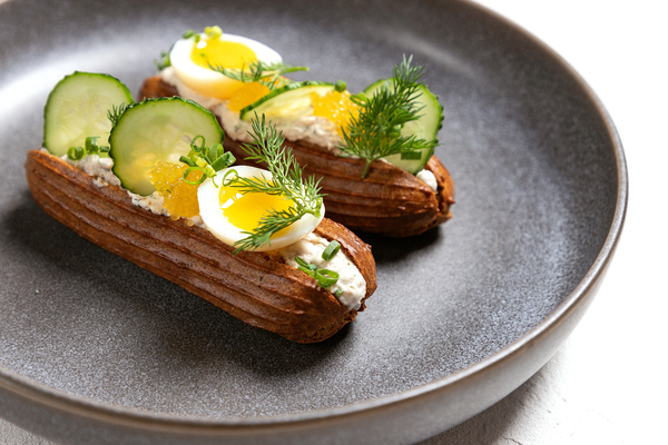 Например, бородинские эклеры с кремом из печени трески (1290 руб.) – отличная закуска перед обедом и классный пейринг к осеннему коктейлю или к порции крепкого напитка. Ароматный бородинский хлеб с хрустящей корочкой, хорошо знакомый с детства, намазан нежным кремом из печени трески и украшен щучьей икрой, половинками перепелиного яйца и овощами.