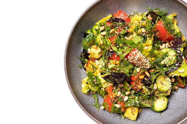 Stefan salad (от 1100 руб.) - свежий овощной салат с зеленью, семенами и орехами, заправленный смесью масел с куркумой. Для тех, кто встал на тропу ЗОЖ или просто следит за рационом, это не пустой звук: куркума известна как мощный антиоксидант и может предупредить многие проблемы. Принесут только пользу и здоровье и остальные ингредиенты: авокадо, томаты, огурцы, ассорти зелени, семена конопли, тыквенные семечки, кедровые орехи, а также горчичное и льняное масло, известные своими полезными свойствами.