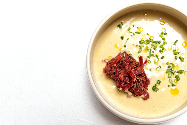 Отличная альтернатива – вишисуаз с бастурмой (1290 руб.): густой картофельно-луковый суп-пюре родом из французской кухни подается в холодном виде с нарезанной соломкой говяжьей бастурмой.