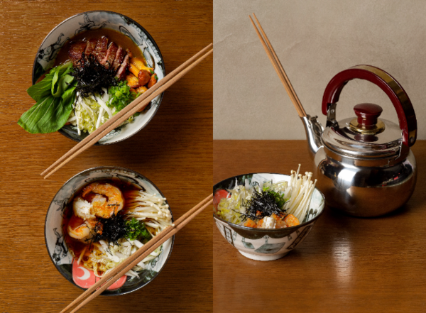 Когда конструктор собран, оказывается, что в миске с уткой, говядиной или креветками есть еще и всякая вкусная всячина вроде тонко нарезанных овощей, грибов, проростков и водорослей, а сама лапша в горячем бульоне приносится в блестящем металлическом чайнике, из носика которого воинственно торчат палочки для еды.