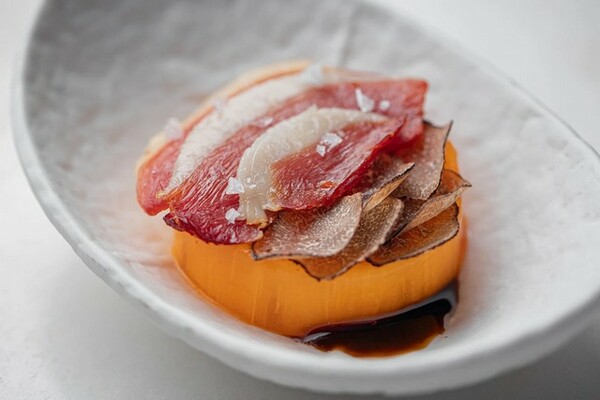 Оленина с запеченным костным мозгом, морошкой и черным трюфелем