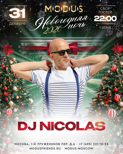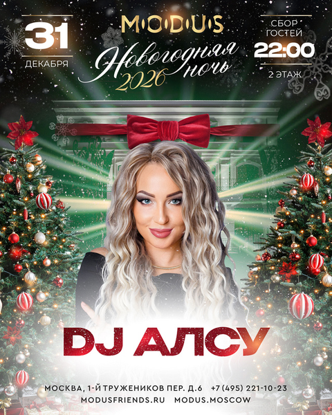 Эта ночь исполнит все желания и оставит заботы позади — гостей ждет вечер настоящего волшебства! Уютный особняк на Плющихе превратится в сияющую сказочную шкатулку, полную чудес. Весь вечер гостей ждут сюрпризы и подарки, и первый из них — оркестр веселых Дедов Морозов, уже ставший визитной карточкой новогоднего MODUS’а. Их заразительная радость мгновенно создаст атмосферу праздника!