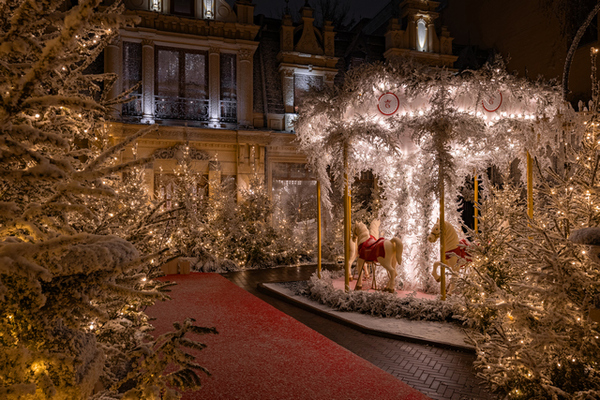 У входа гостей встречает, нарядная пятиметровая елка, украшенная шарами и огнями гирлянд. А рядом сияющая иллюминацией карусель с лошадьми — символами будущего года — она уже стала любимым местом для зимних снимков. Все вокруг покрыто мягким белым снегом — от фасадов до верхушек деревьев.