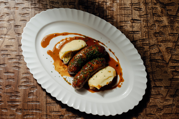 Бургер с мясом страуса – 1830 руб. Колбаска «Буреворс» из ягненка с картофельным пюре – 1830 руб.