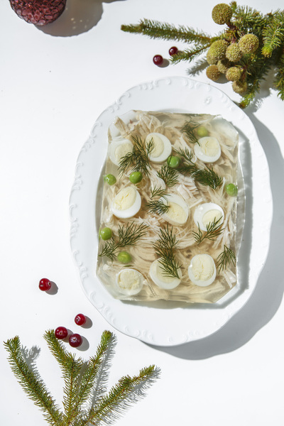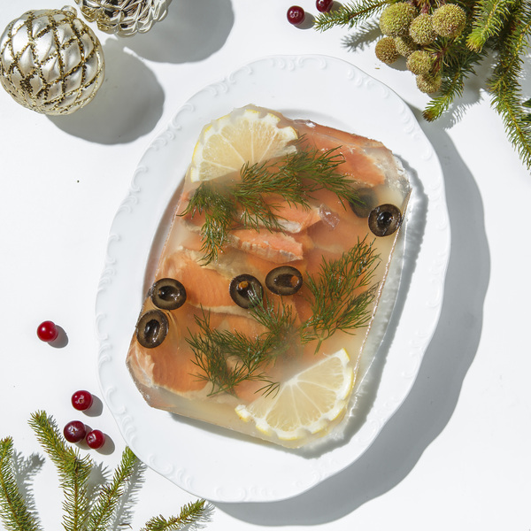 В этом же разделе: целая коллекция заливного, настоящая цитата из советского праздничного новогоднего застолья, когда на столе обязательно было блюдо, которое можно было разглядывать как витраж. В ассортименте: заливное из говяжьего языка, заливное из нерки, холодец из фермерской телятины, холодец из телятины «парфе» и холодец из фермерской утки.