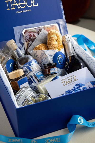 В греческом из ресторана Пафосе гости найдут домашние оливки с артишоками, греческий сыр, оливковое масло, кулури, греческие специи, сесину, травяной чай, фирменные конфеты и два вида джема – из инжира и оливок. Также в боксе предусмотрено просекко. Стоимость праздничного бокса составляет 14,5 тысяч рублей.