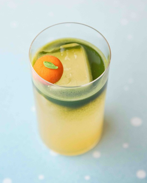 И яркий цитрусовый коктейль Kogarashi (850 р.) с ликером юдзу и чаем матча, украшенный шоколадной фигуркой в виде мандарина.