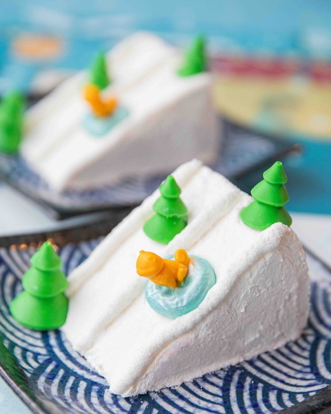 Ещё из сладкого – бисквитный торт Christmas slide с фисташкой и малиной (790 р.), который выглядит как маленькая зимняя сцена: шоколадный сиба-ину в окружении шоколадных елей съезжает по «горке» из сливочного крема.