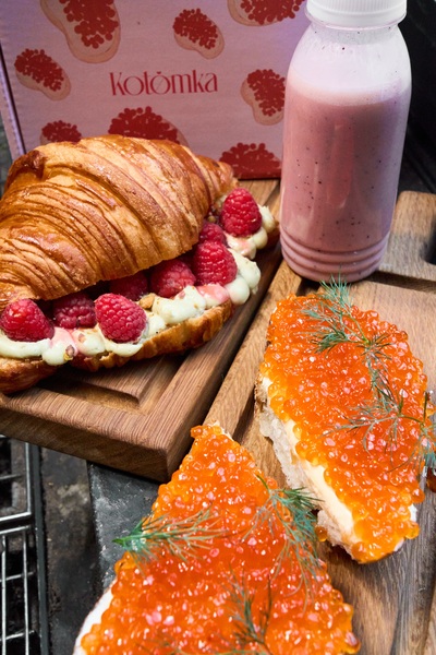 Мы сделали понятный сытный завтрак, а магазин товаров для дома «Котомка» добавил к нему мини-бокс с предметами в цирковом стиле. Этот стиль повторяет визуальный вайб нашего фасада: яркий, графичный, с акцентами, которые уже стали узнаваемыми на улице.
