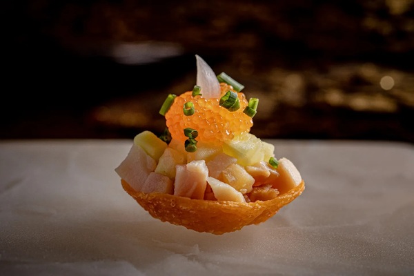 Тартар из осетрины горячего копчения с жемчужным луком и икрой сига 600 руб.;