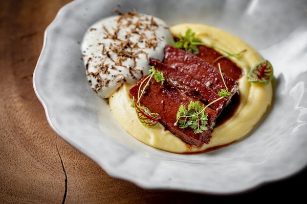 Креспелле с красной икрой, пастрами с муссом из пармезана и оливье с грибными нотами превращают классические блюда в интересные вкусовые открытия, где каждый ингредиент ощущается глубоко и насыщенно.