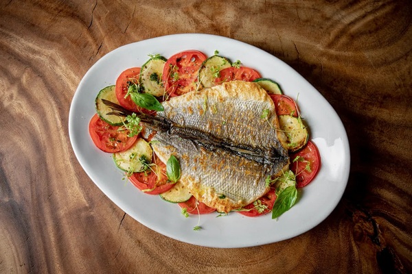 Сибас с капонатой из овощей — 1630 руб.; Классический тирамису — 770 руб.