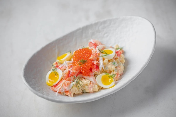 Оливье с перепелкой / с камчатским крабом 2250.-/2550 руб.; Паштет из утки с фуа-гра и мандаринами 890 руб.;