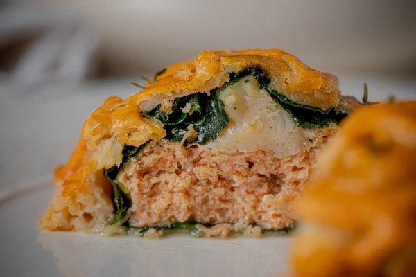 Пирог с форелью, шпинатом и копченой сметаной 1790 руб.; Ребро теленка с брусникой и черными лисичками 2970. руб.;