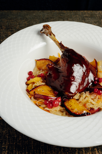 На горячее — блюда основательные и согревающие: баранья голяшка с овощами (1890 руб.), нежная разварная говяжья грудинка (1950 руб.), ароматный свияжский пирог с телячьими щёчками (1190 руб.) и утиная ножка с капустой (990 руб.).