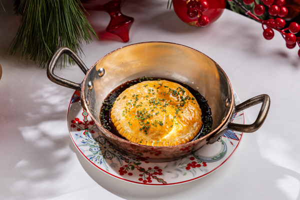 Слоеный пирог с уткой, фуа-гра и луковым консоме
