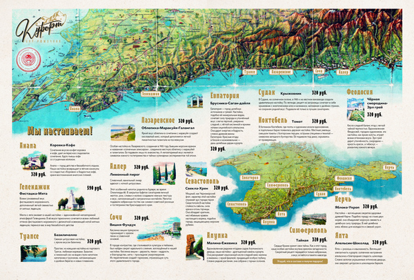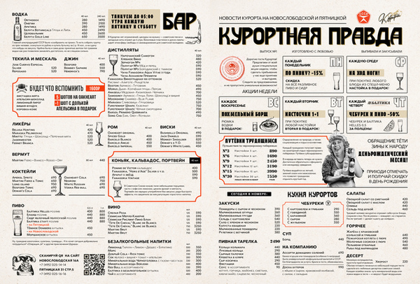 Теперь меню «Курортов» выглядит как газета «Курортная правда», на развороте которой располагается карта Черноморского побережья – цветная, как из советских школьных атласов – с обозначением самых знаменитых городов, где мечтал отдохнуть каждый советский житель.