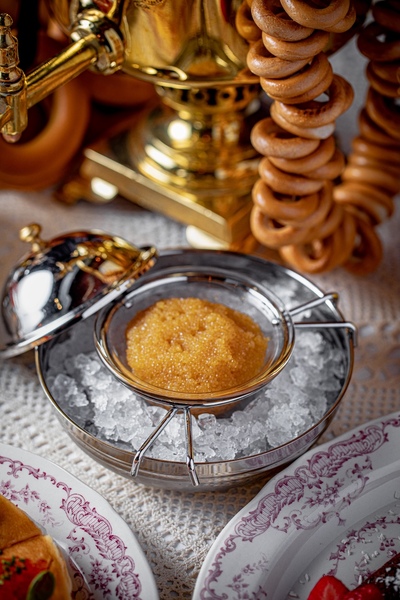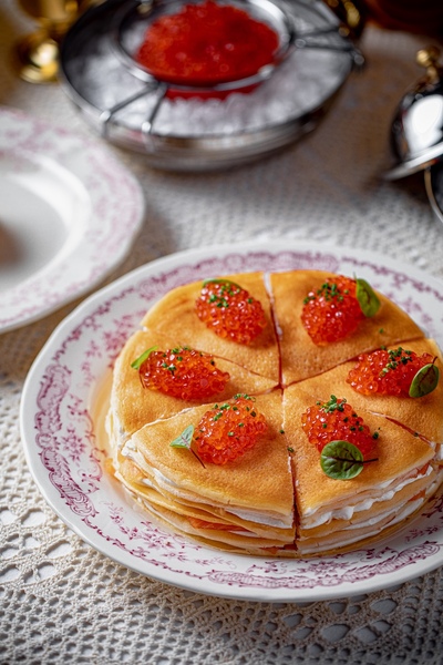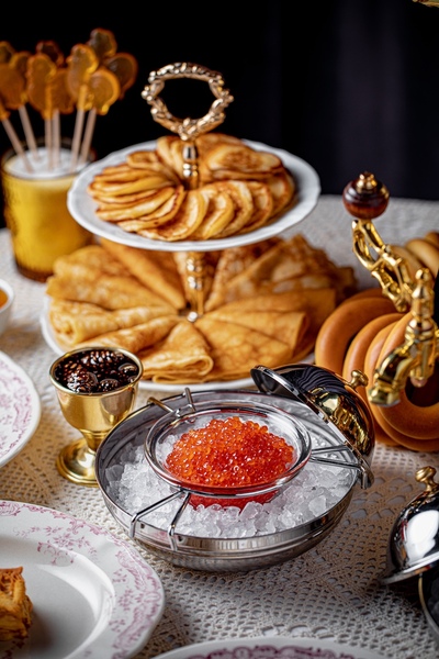 Блинное предложение ресторана — весьма щедрое. Для семейных и дружеских посиделок шеф разработал «Праздничный сет с самоваром». В него входят 15 ажурных блинчиков, 15 пышных оладушек, всевозможные топпинги (икра лососевая и щучья, сметана и варенье, мед и сгущенка), а также бублики, баранки и традиционный для масленичных застолий большой самовар чая.При желании можно собрать и свой блинный стол: заказав блины и оладьи поштучно и дополнив их икрой (черной, красной, щучьей), слабосоленым лососем или чем-то более привычным — сгущенкой, медом или вареньем.В масленичном special есть и авторские блинные позиции: блинный торт с лососем и крем-чизом, блинные рулетики с камчатским крабом и блины с мраморной говядиной и грибами. А для всех, кто блины считает исключительно десертом — шоколадные с кокосом и блинный торт с маскарпоне и орехом пекан
