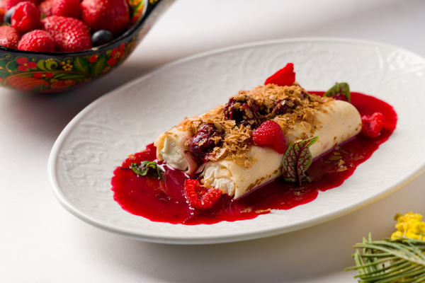 Не забыли в «Кафе Чайковский» и о десертной стороне Масленицы. Налистники с начинкой из двух видов творога и апельсиновыми цукатами (720 руб.) запекают под ароматным апельсиновым соусом, а блины с «пьяной» вишней (640 руб.), крем-чизом и белым шоколадом подают с вафельной крошкой и малиной — как финальный аккорд масленичного застолья.