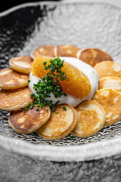 Оладья со щучьей икрой и сметаной – 1300 руб.;