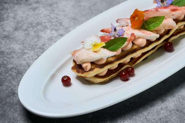 Солодовые шанежки с крабом, кремом из форели и красной смородиной, 2 590 руб.;