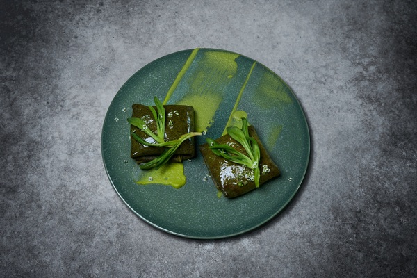 В зелёные блинчики с морской капустой он заворачивает начинку из подкопчённой белуги, солёных белых груздей, маринованного лука и домашнего соуса, а украшает их хрустальной травой и цветами алиссума.