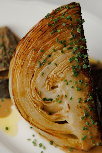 Особого внимания заслуживают: запеченный картофель с соусом из петрушки (950 руб.), запеченные мини-перцы с хумусом (950 руб.) и стейк из молодой капусты с соусом из сморчков (1100 руб.).