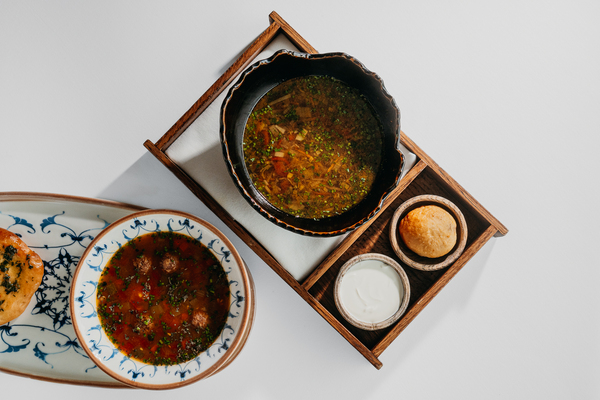 Среди супов: чечевичный суп с «митболами» из соевого мяса и постной лепешкой (950 руб.), грибной суп с пельменями, древесными грибами и соевыми ростками (950 руб.), а также весенние щи с постным пирожком с грибами (950 руб.). Основные блюда строятся на сочетании выразительных текстур и соусов: гратен из капусты с растительным мясом, тимбаль из белых грибов и овощной жу с трюфелем (1500 руб.), гречневая паста «соба» с растительным мясом и азиатским соусом (1500 руб.), перцы рамиро, фаршированные соевым мясом с томатным соусом вьерж и соевой сметаной (1500 руб.), а также вареники с картофелем, капустой с укропом, релишем и овощным бульоном (900 руб.).