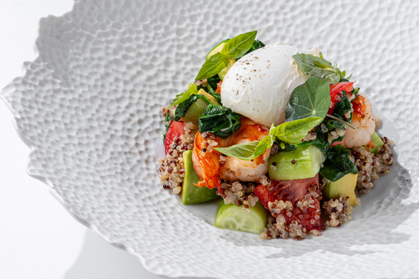 Так появился салат с жареной креветкой, киноа и свежими овощами (1 600 руб.) — вариант для тех, кто с утра выбирает нечто свежее, но содержательное. Вместо привычных утренних акцентов здесь — теплая креветка с выразительной текстурой, сочные томаты и огурцы, авокадо, а связующим элементом выступает киноа. Зерно не растворяется в соусе, а, напротив, деликатно объединяет ингредиенты, создавая ощущение многослойности. Ореховый соус гамадари добавляет глубины и мягко обволакивает композицию.