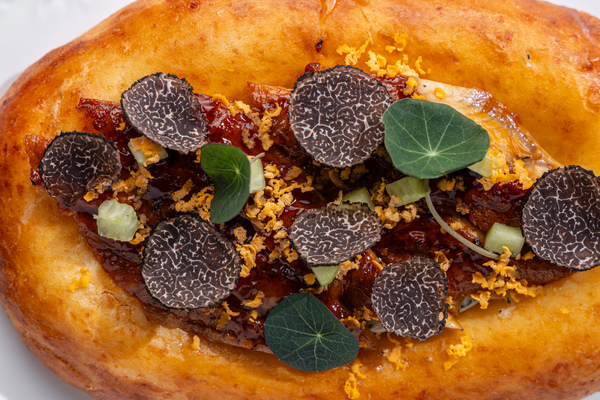 Продолжением этой идеи стала домашняя кефирная лепешка с творожным сыром, копченым угрем и трюфельным соусом (1 600 руб.). Нежная, с легкой кисломолочной нотой, она служит основой для сливочного сыра, ломтиков угря, свежего огурца и тертого яйца. Трюфельный акцент делает вкус более объемным, но не доминирующим. Позиция получилась одновременно авторской и понятной — элегантной, но универсальной.