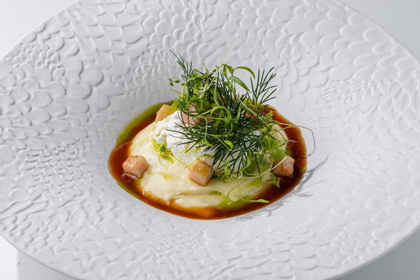 Любовь Андрея Жданова к картофелю воплотилась в еще одной новинке — картофельном пюре с яйцом пашот, жареной индейкой и соусом чимичурри (780 руб.). Нежное пюре, сочные кубики индейки и текучий желток создают плотную, но сбалансированную структуру блюда, а травяной соус добавляет свежести и динамики.