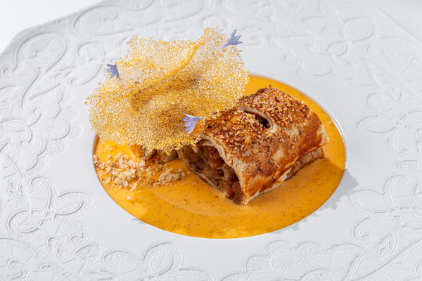 Финальной нотой стал штрудель с соусом англез и грецким орехом (650 руб.). Вместо привычного мороженого — теплый ванильный английский крем, который делает десерт мягче и уместнее в утреннем формате.